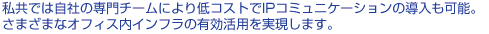 | 当社はオカムラとのコラボレーションにより、最新のオフィスシステム機器を提供。プランニングから各種工事まで対応可能な一括受注システムにより、業務拡大やスタッフ増員などの急成長にも対応しやすいオフィスシステムを提案します。また、私共では自社の専門チームにより低コストでIPコミュニケーションの導入も可能。さまざまなオフィス内インフラの有効活用を実現します。 |
